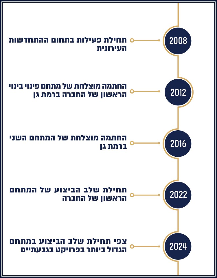 החזון שלנו הוא להתמקד בשני צירים מרכזיים. האחד הוא ציר ז'בוטינסקי ברמת גן, שם עובר הקו האדום של הרכבת הקלה, ובו אנחנו מקדמים 5 מתחמים של מגדלים 40-50 קומות בשלבי תכנון. הציר השני הוא כצנלסון בגבעתיים שם יעבור קו M2 של המטרו העתידי דרך תחנות נגה וכצנלסון. נבחרנו כבר על ידי שבעה מתחמים בצירים האלה ואנחנו מתכננים להפוך אותם לדבר הגדול הבא – אביב ייזום תהיה חברה מובילה בעלת מוניטין בערים האלה.