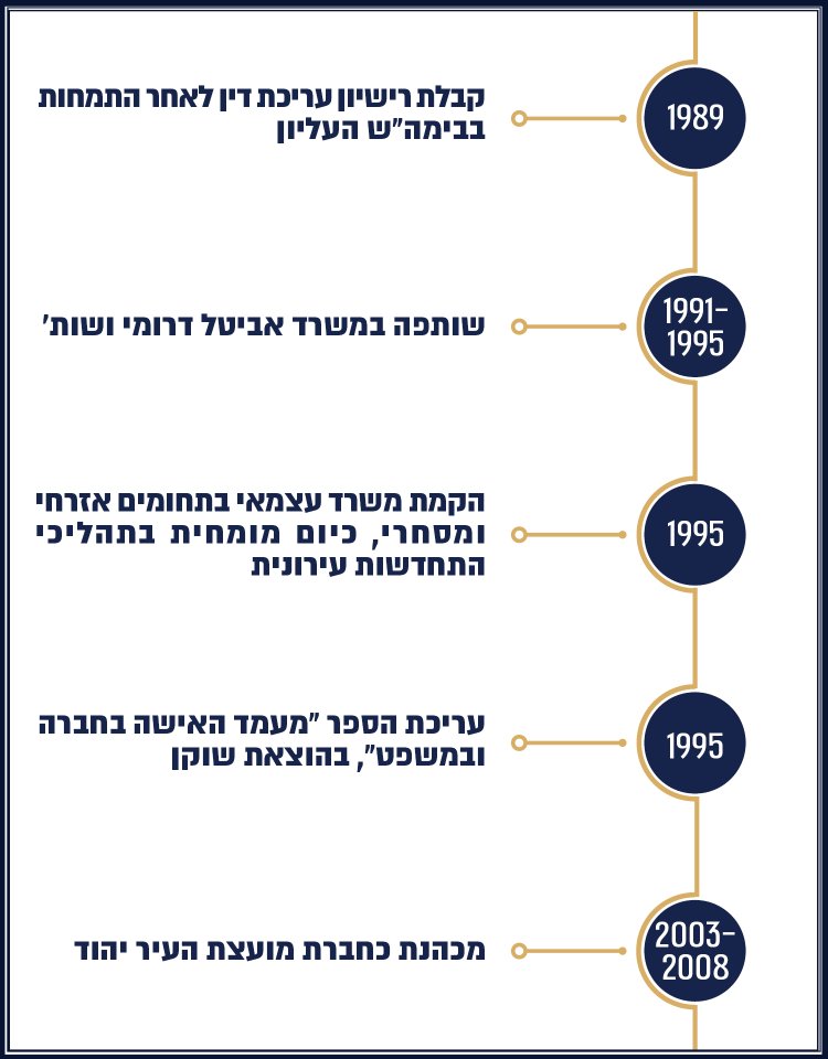 אני תושבת העיר יהוד מעל ל-50 שנה וכיהנתי כחברת מועצת העיר בין השנים 2003-2008, תפקיד שכלל חברות בוועדת משנה לתכנון ובניה וניהול תיק החינוך בעיר. בשנת 2003 פנו אליי כמה דיירים המתגוררים בעיר בבקשה לייצוג ובמקביל לדיירים בפתח תקוה. אלה היו החוזים הראשונים בארץ בתחום ההתחדשות העירונית. אני זוכרת כיצד הוצאנו מים מהסלע – המצאנו חלק גדול מהמונחים השגורים היום כמו ערבות חוק מכר משופרת, שדרוג-שנמוך, מקטע בר ביצוע ועוד. אני לא אשכח איך נדרשתי לתת מענה לדיירת עיוורת בפרויקט. היא חיה בדירתה במשך 40 שנה והחלטתי שלא יתכן שהיא תעבור דירה פעמיים במסגרת ההתחדשות. הגענו לסיכום עם היזם על מתווה של קבלת דירה חדשה במקום אחר או בפרויקט, לבחירתה, וכך היא תוכל לבחור לעבור דירה רק פעם אחת. להמציא דברים חדשים זה כיף מקצועי גדול ולתת מענה ייחודי ונדרש לדיירים זה מספק מאוד. הדיירים המוגבלים, המבוגרים והמתקשים מאוד קרובים לליבי.