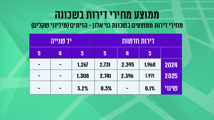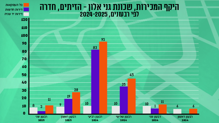 בין החציון הראשון של 2024 לחציון הראשון של 2025, נרשמה בשכונה עליה של כ-1% במחיר ממוצע של דירה, לצד עליה של כ-129% בכמות העסקאות בין התקופות. זאת לעומת עלייה של כ-3% במחיר דירה בכל חדרה באותה תקופה, אם כי בעיר עצמה לא נרשם שינוי בכמות העסקאות בין התקופות. וכמה תעלה לכם דירה בשכונה הוותיקה? על דירת 3 חדרים חדשה בגני אלון - הזיתים תשלמו בממוצע 1.971 מיליון שקל, על דירת 4 חדרים חדשה תשלמו 2.396 מיליון שקל ועל דירת 5 חדרים חדשה תשלמו בממוצע 2.741 מיליון שקל. דירת 3 חדרים יד שנייה תעלה לכם בממוצע 1.308 מיליון שקל. מדובר במחירים שזולים בכעשרה אחוזים לעומת הממוצע בחדרה.