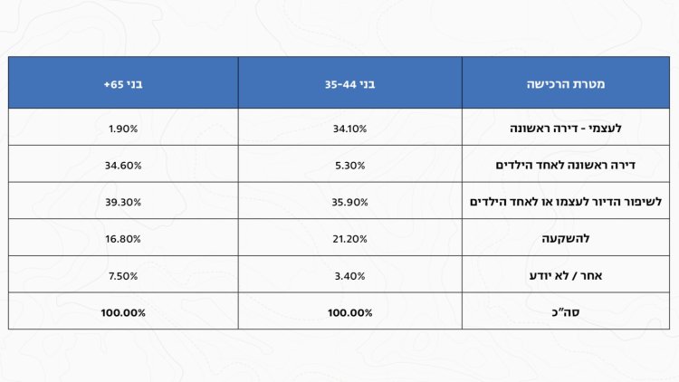 אולם הממצא המשמעותי ביותר במחקר הוא שונה. בעוד שאצל רבים מזוהה רכישת דירות באופן אוטומטי עם אוכלוסייה צעירה יחסית, מגלה הסקר כי חלקם של בני הגיל השלישי – בני ה-65 ומעלה - ברכישת דירות הוא גבוה משמעותית מהמקובל לחשוב.