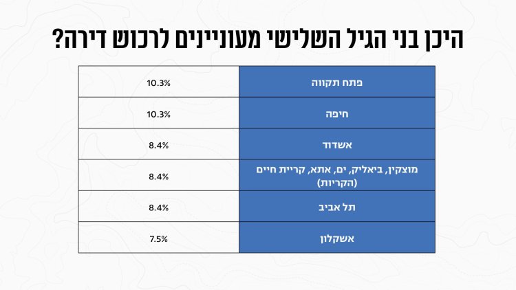 בחינת המיקומים הגיאוגרפיים שבהם מתעניינים בני הגיל השלישי ברכישת דירה הובילה להפתעה נוספת, כאשר את המקום הראשון חולקות פתח תקווה וחיפה, כל אחת עם 10.3% מהמשיבים. עוד בצמרת אשדוד ותל אביב-יפו עם כ-8.4% כל אחת, ואשקלון עם 7.5%.