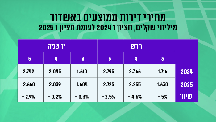 שינוי שנתי במחירי הדירות: ירידה של כ-2.5% בין חציון ראשון 2024 לבין חציון ראשון 2025 לפי מחיר ממוצע לדירה, ירידה של כ-1% במחיר הממוצע למ"ר, ירידה של כ-24% בכמות העסקאות בעיר בין התקופות.