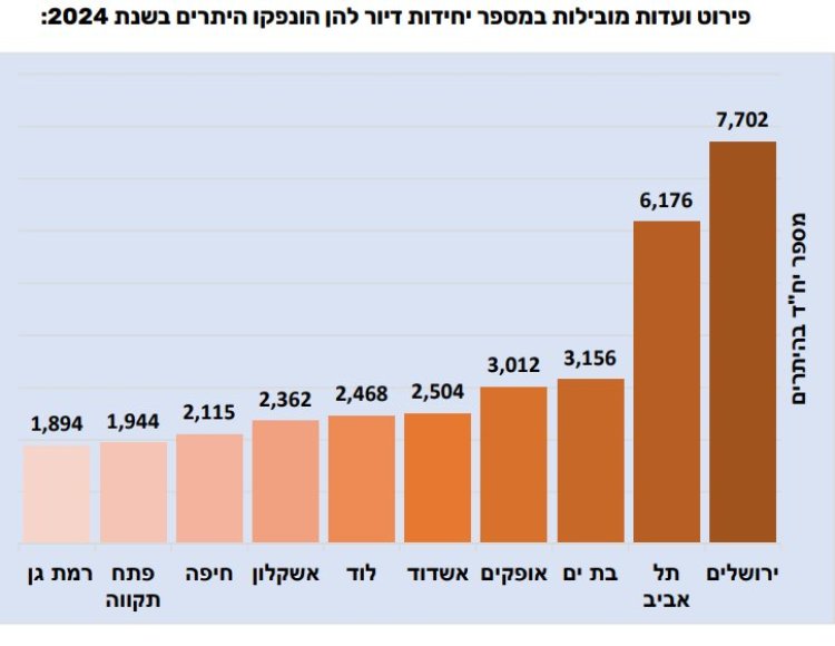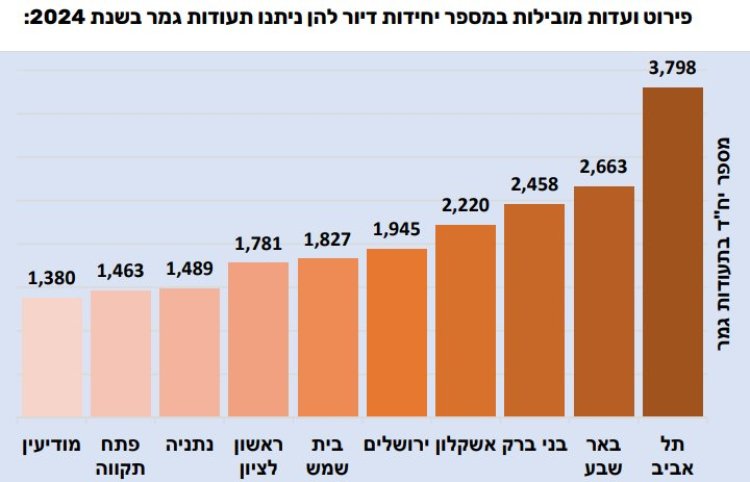 את היקף הוצאת תעודות הגמר מובילה הוועדה המקומית תל אביב עם 3,798 יח"ד שאוכלסו בה במהלך 2024, ואחריה באר שבע (2,663 יח"ד), בני ברק (2,458 יח"ד), אשקלון (2,220 יח"ד), ירושלים (1,945 יח"ד), בית שמש (1,827 יח"ד) וראשון לציון (1,781 יח"ד).