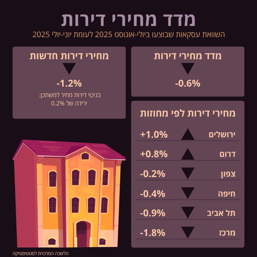 מחירי הדירות בישראל ממשיכים לרדת זה החודש השישי ברציפות, כך עולה ממדד מחירי הדירות שפרסמה הערב (ד') הלשכה המרכזית לסטטיסטיקה (הלמ"ס). על פי המדד, מהשוואת מחירי העסקאות שבוצעו בחודשים יולי-אוגוסט 2025, לעומת מחירי העסקאות שבוצעו בחודשים יוני-יולי 2025, נמצא כי מחירי הדירות ירדו בשיעור של 0.6%.