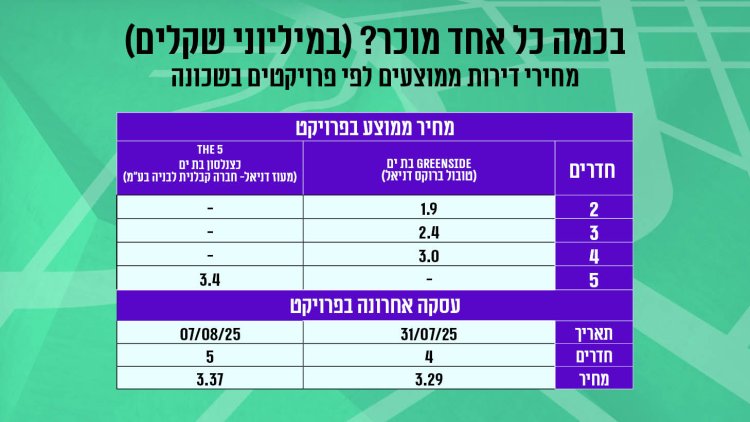 בין החציון הראשון של 2024 לחציון הראשון של 2025 נרשמה בשכונה עליה של כ-3% במחיר דירה, לצד ירידה של כ-24% בכמות העסקאות בין התקופות. דירת 3 חדרים חדשה ברמת יוסף תעלה לכם בממוצע 2.431 מיליון שקל ואילו דירת 5 חדרים חדשה תעלה לכם בממוצע 3.340 מיליון שקל. דירת 2 חדרים יד שנייה תעלה בממוצע 1.663 מיליון שקל ואילו דירת 3 חדרים יד שנייה תעלה 1.850 מיליון שקל בממוצע. על דירת 4 חדרים יד שנייה תשלמו 2.210 מיליון שקל. מדובר במחירים זולים בכמה אחוזים לעומת הממוצע העירוני בכלל בת ים, הפרש שלעיתים יכול להגיע גם ל-10%.