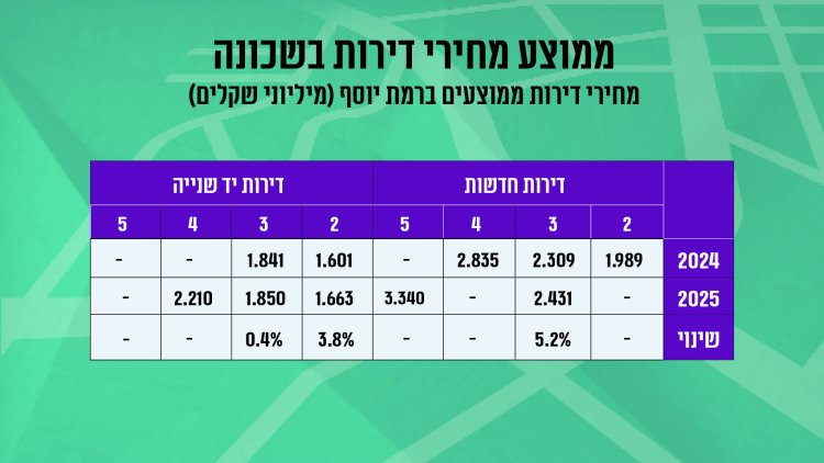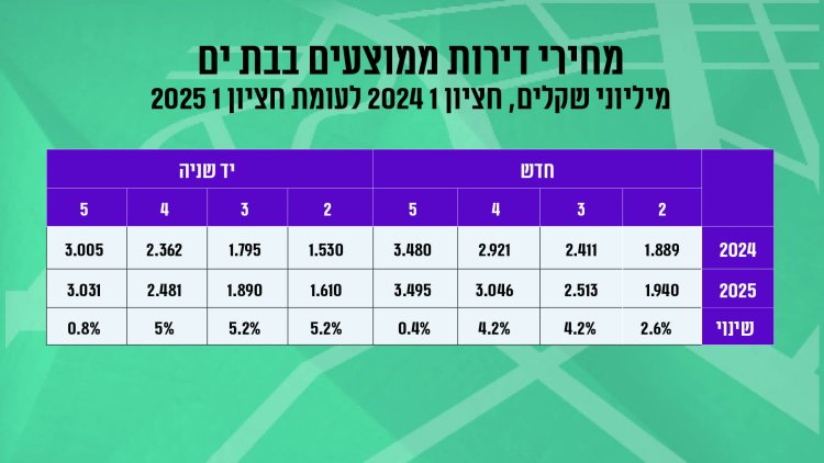 שינוי שנתי במחירי הדירות: עליה של כ-3% בין חציון ראשון 2024 לבין חציון ראשון 2025 לפי מחיר ממוצע לדירה, עליה של כ-3% במחיר הממוצע למ"ר, ירידה של כ-17% בכמות העסקאות בעיר בין התקופות
