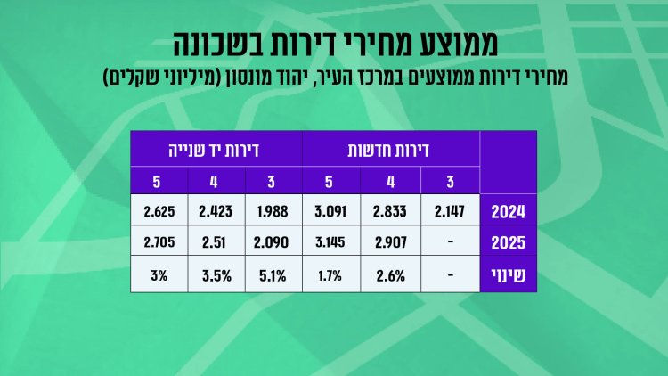 בין החציון הראשון של 2024 לחציון הראשון של 2025 נרשמה במרכז העיר עליה של כ-3% במחיר ממוצע של דירה, לצד ירידה של כ-34% בכמות העסקאות בין התקופות. מדובר בעלייה דומה לזו שהתרחשה בכלל יהוד מונוסון בתקופה הזו, אך בממוצע העירוני נרשמה עליה של כ-51% בכמות העסקאות. דירת 3 חדרים יד שנייה במרכז יהוד מונוסון תעלה לכם בממוצע 2.090 מיליון שקל, דירת 4 חדרים יד שנייה תעלה 2.5 מיליון שקל ודירת 5 חדרים יד שנייה כבר תעלה בממוצע 2.7 מיליון שקל. דירת 4 חדרים חדשה בשכונה הוותיקה המתחדשת תעלה בממוצע 2.9 מיליון שקל ודירת 5 חדרים חדשה תעלה 3.145 מיליון שקל.