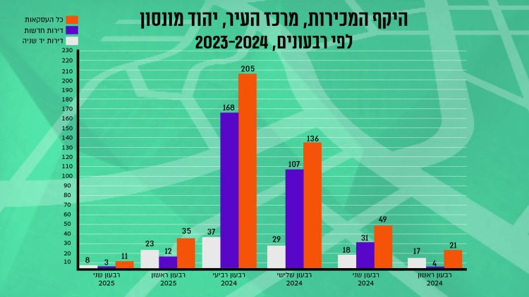 באופן כללי, מרכז העיר ביהוד מונוסון מתומחר קצת מתחת לממוצע העירוני, במיוחד בדירות יד שנייה הגדולות: בדירות 4 חדרים יד שנייה המרכז זול בכ-5%, ובדירות 5 חדרים יד שנייה הפער אף מגיע לכ-8%. בדירות 3 חדרים יד שנייה כמעט אין פער. בדירות חדשות התמונה מעורבת: ב-4 חדרים חדשה המרכז אפילו יקר בכ-3%, בעוד שב־5 חדרים חדש הוא זול בכ-3%-4%. בשורה התחתונה: במרכז העיר המחירים זולים יותר בכמה אחוזים, בעיקר בדירות יד שנייה הגדולות. בסוף 2024 הייתה התפוצצות במכירת דירות יד שנייה עם מאות עסקאות שנרשמו, מספר שצנח דרמטית בתחילת 2025 עם עשרות בודדות של עסקאות.