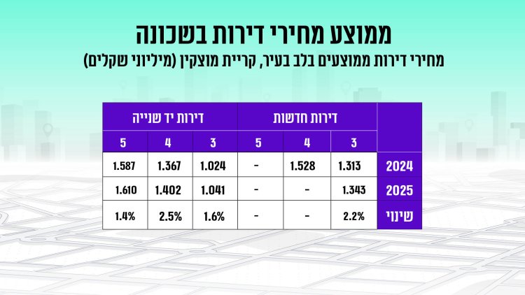 בין 2024 ל-2025 נרשמה בשכונה עלייה של כ-2% במחיר ממוצע של דירה, לצד ירידה של כ-38% בכמות העסקאות בין התקופות. זאת לעומת עלייה כפולה, של 4% במחיר ממוצע של דירה בכלל קריית מוצקין באותה תקופה. וכמה תעלה לכם דירה בלב מוצקין? על דירה יד שנייה 3 חדרים תשלמו בממוצע 1.041 מיליון שקל, על דירת 4 חדרים יד שנייה תשלמו בממוצע 1.402 מיליון שקל ועל דירת 5 חדרים יד שנייה תשלמו כבר 1.610 מיליון שקל. דירת 3 חדרים חדשה תעלה לכם בממוצע 1.343 מיליון שקל.