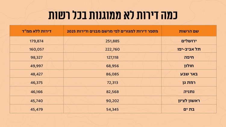 לפי המסמך, בראש הרשימה עומדת ירושלים עם כ-180,000 דירות ללא ממ"ד, אחריה תל אביב-יפו עם כ-160,000 דירות, וחיפה עם כ-98,000 דירות. ערים נוספות עם מספר גבוה של דירות ללא ממ"ד כוללות את חולון (כ-50,000), פתח תקווה (כ-49,000), באר שבע (כ-48,000), רמת גן (כ-46,000), נתניה (כ-46,000), ראשון לציון (כ-46,000) ובת ים (כ-45,000).