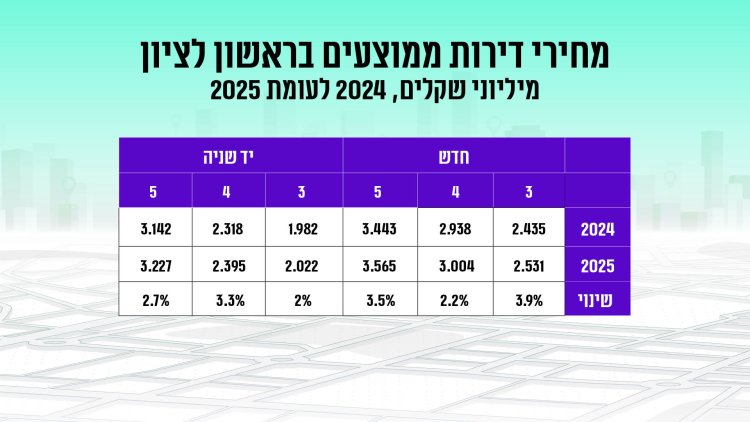 שינוי שנתי במחירי הדירות: עליה של כ-3% בין שנת 2024 לבין שנת 2025 לפי מחיר ממוצע לדירה, עליה של כ-1% במחיר הממוצע למ"ר, ירידה של כ-12% בכמות העסקאות בעיר בין התקופות.