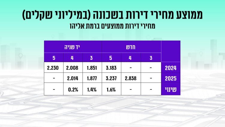 בין 2024 ל-2025 נרשמה ברמת אליהו עליה של כ-1% במחיר ממוצע של דירה, לצד עליה של כ-36% בכמות העסקאות בין התקופות. זאת לעומת עלייה של 3% במחיר ממוצע של דירה בכלל ראשון לציון באותה תקופה. בהשוואת רמות המחירים עצמן, עולה כי דירות ברמת אליהו זולות משמעותית מהממוצע העירוני בראשון לציון. בדירות חדשות מדובר בפער של כ-10%–15%, בעוד שביד השנייה הפער גדול יותר ומגיע לכ-20%-30% מתחת למחירים הממוצעים בעיר. כלומר, רמת אליהו נמצאת באופן עקבי מתחת לרמת המחירים העירונית, עם הנחה בולטת יותר בשוק היד השנייה.