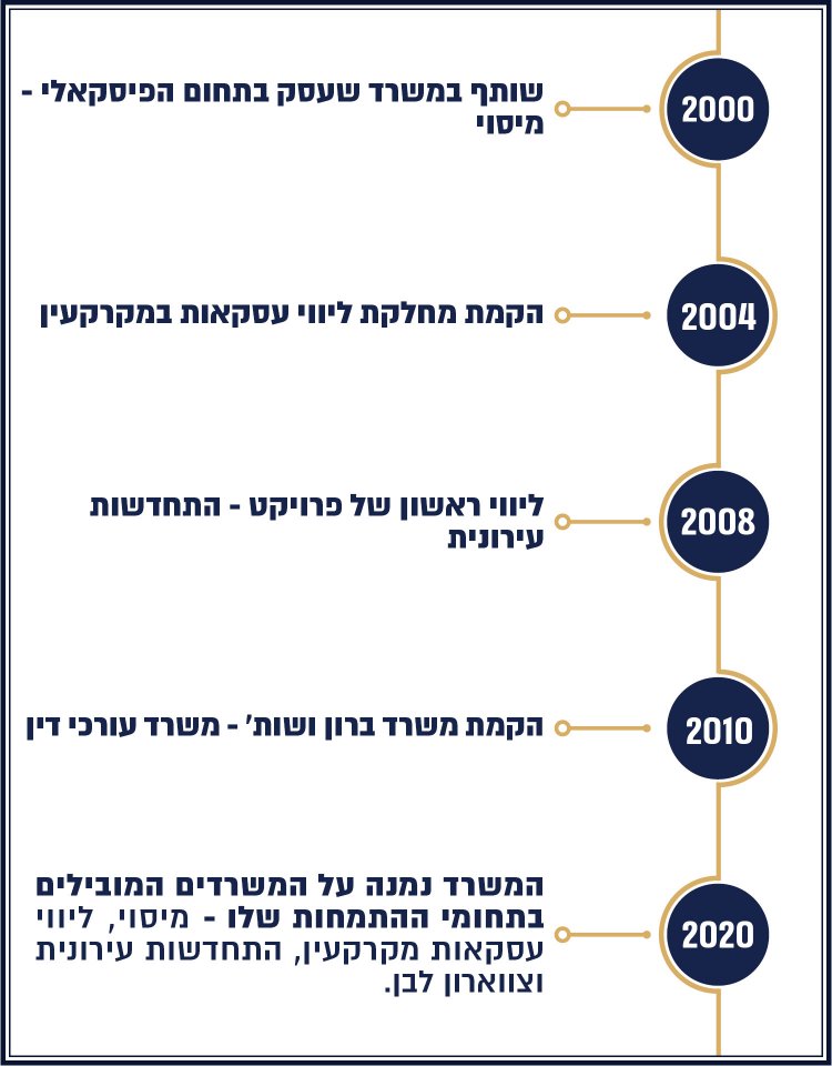המשרד עוסק בתחום הנדל"ן והמיסוי מאז היווסדו והיה זה מהלך כמעט טבעי לעסוק גם בתחום ההתחדשות העירונית. התחום היה בחיתוליו, אף אחד לא דיבר את השפה – לא הדיירים, לא עורכי הדין, לא הבנקים ולא היזמים. השנים האלה היו מאתגרות במיוחד ולנו הייתה הזכות לכתוב את מסמכי הליווי הראשונים לפרויקט תמ"א 38 \1, לרבות עם הבנק המלווה.