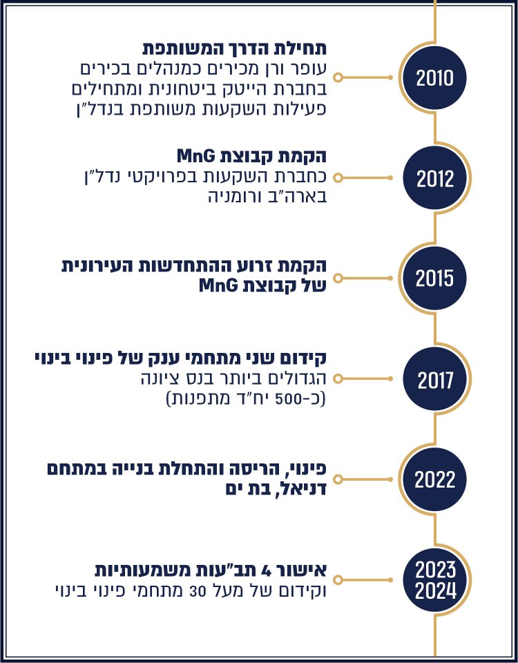 עופר: "הכרנו כמהנדסים ומנהלים בחברת הייטק בכירה בתעשייה הביטחונית. החיבור בינינו היה מיידי ובכל הזדמנות פנויה מצאנו את עצמנו משוחחים על יזמות נדל"ן, על השקעות ועל פרויקטים שכל אחד מאיתנו קידם באותה תקופה. חשבנו איך לקחת את התשוקה המשותפת שלנו לנדל"ן ויזמות ולחבר אותה לעולם הערכים המשותף עימם הגענו מהבית, של עזרה לזולת, יושרה, אהבת אדם וציונות. מצאנו שההתחדשות העירונית מחברת בצורה מושלמת בין העולמות הללו ומאפשרת לנו להביא לידי ביטוי את היתרון היחסי שלנו".