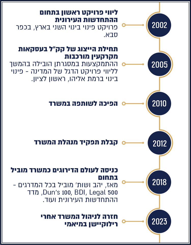 "בניגוד לרבים מעורכי הדין שיכולים להגיד היום שהם בחרו לעסוק בתחום ההתחדשות העירונית, אני צמחתי עם התחום. כחלק ממשרד עורכי הדין יהב ושות', שהוא מחלוצי ההתחדשות העירונית, ליוויתי את הפרויקט השני בארץ בתחום, עוד לפני שכל מה שידוע כיום כהתחדשות עירונית היה קיים. באותה התקופה, התכלית הייתה לשנות את פני הקהילה, ככה ראינו את זה. להצעיר ולשפר את הערים. עוד לא היה אפילו את האפקט הכלכלי כמוביל שקיים היום. וככה נכנסנו לתחום ואני, כחלק מהמשרד, ליוויתי את הפרויקט והשלמתי אותו עד לאחר האכלוס. תוך כדי הליווי הזה, ליווינו את הבנקים ואת רמ"י בכתיבת הנהלים של ההתחדשות העירונית, ובעצם ממש הקמנו תחום. זה היה תהליך מאוד משמעותי, וזה תחום מאוד מרגש. יש בו באמת תכלית חברתית, סיפור אנושי שהוא הרבה מעבר לנדל"ן גרידא, ברמת הבטון והקירות".