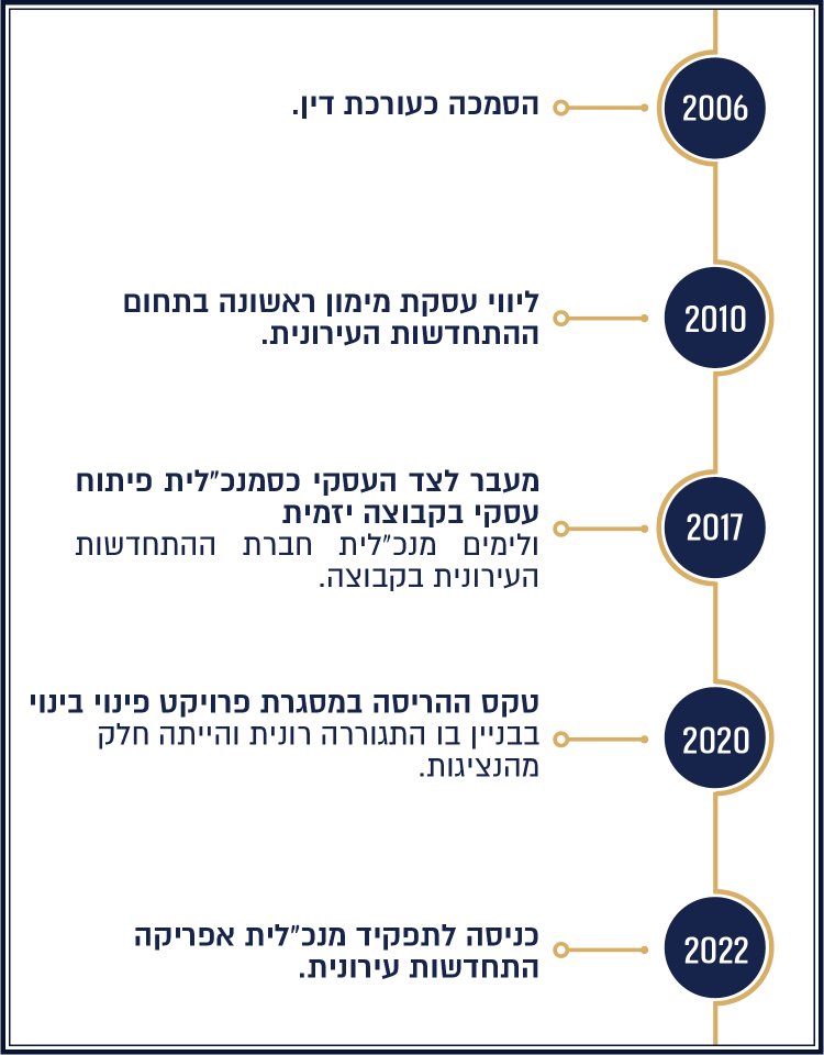 בתחילת הדרך הייתי מעורבת בעסקאות נדל"ן כעורכת-דין ועבדתי בעיקר בייצוג יזמים וגורמים מממנים. הפעם הראשונה שעסקתי בקרביים של התחדשות עירונית , עדיין בצד המשפטי, הייתה ב-2010 כאשר אחד הבנקים הגדולים פנה אליי כדי שאייצג אותו בפרויקט התחדשות עירונית בפתח תקווה. למדתי את העסקה מכל הצדדים שלה - זה היה מדהים.
